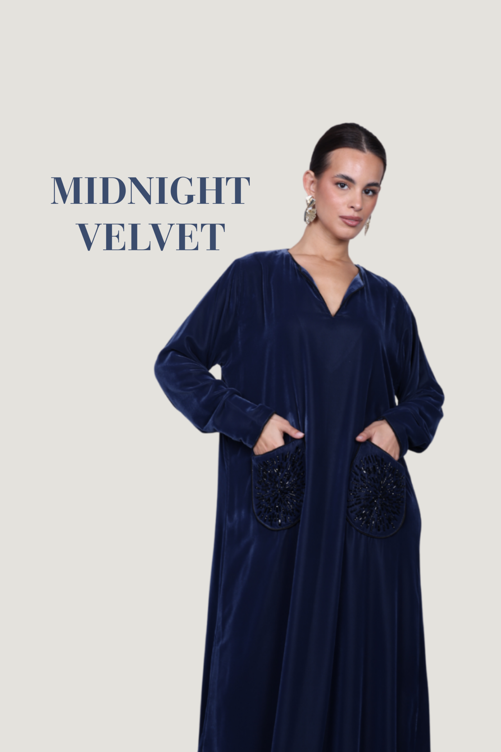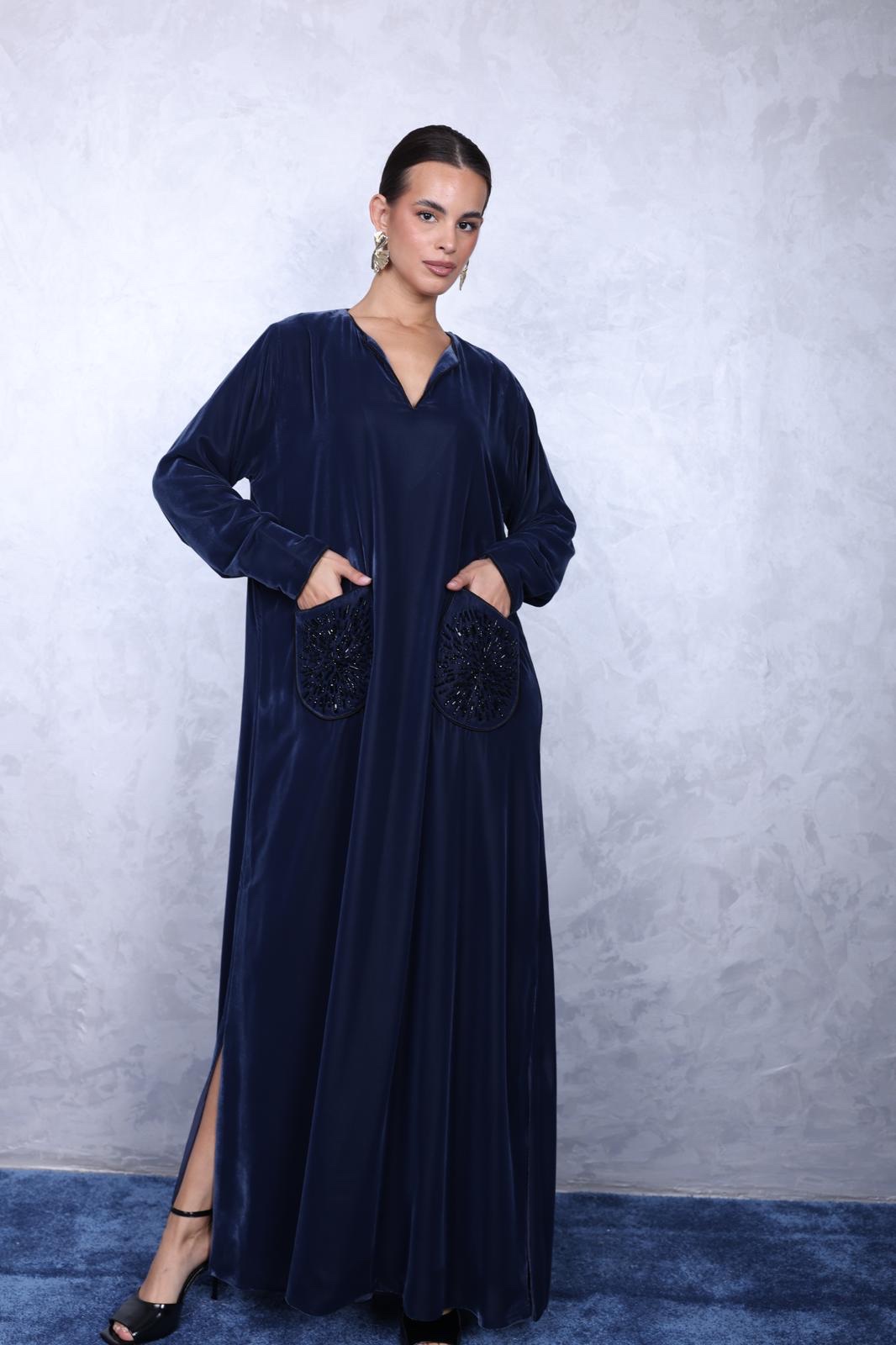 Velvet jalabiya featuring embellished pockets, an A-cut silhouette, and side slits.