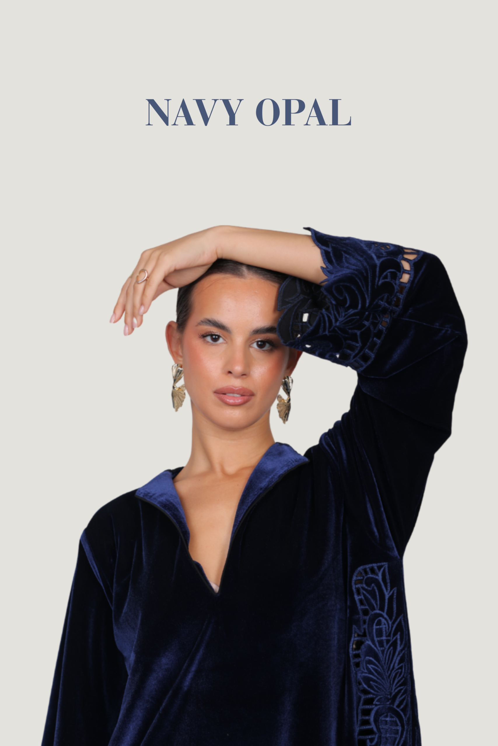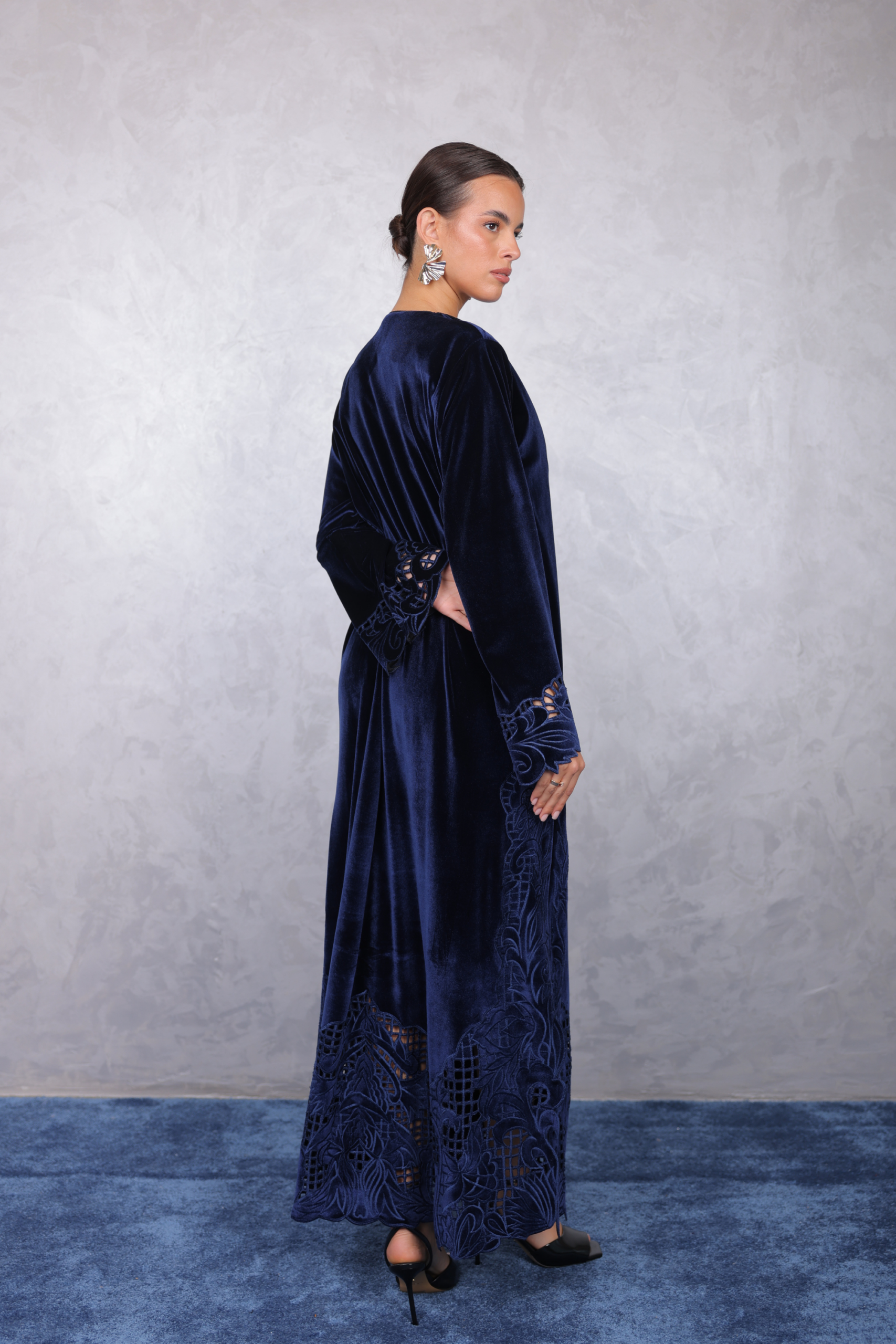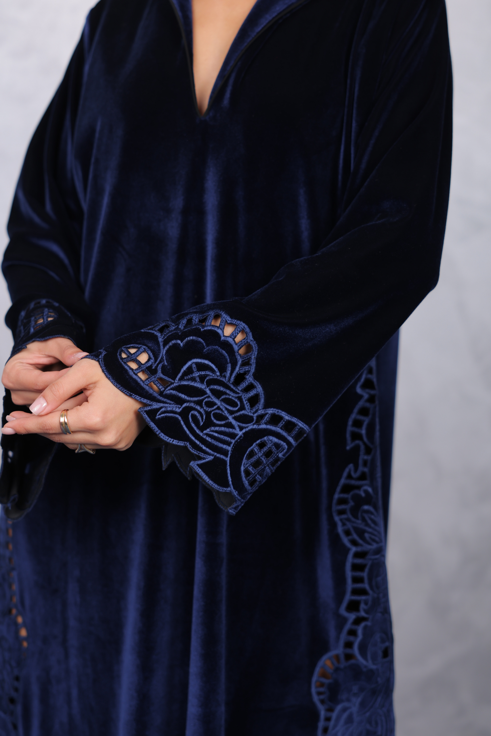 Velvet jalabiya featuring intricate cutwork embroidery on the sleeves, finished with a flowing silhouette.